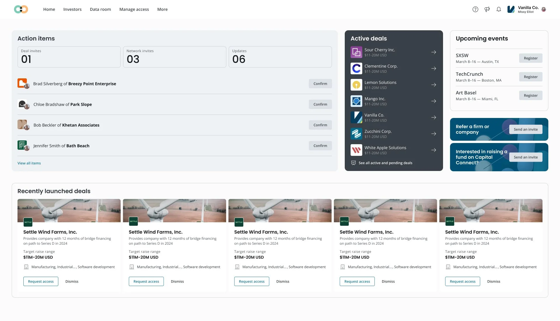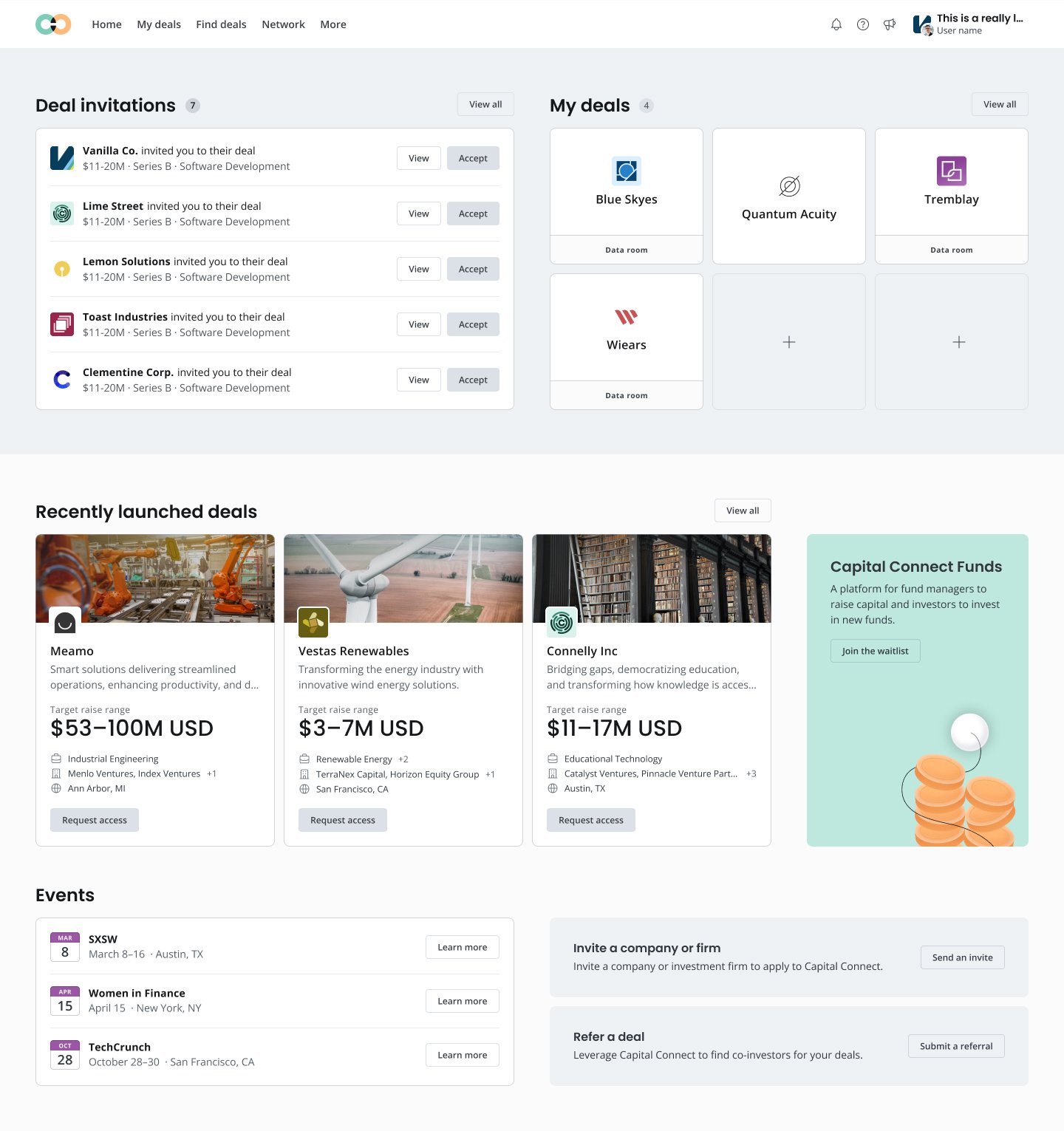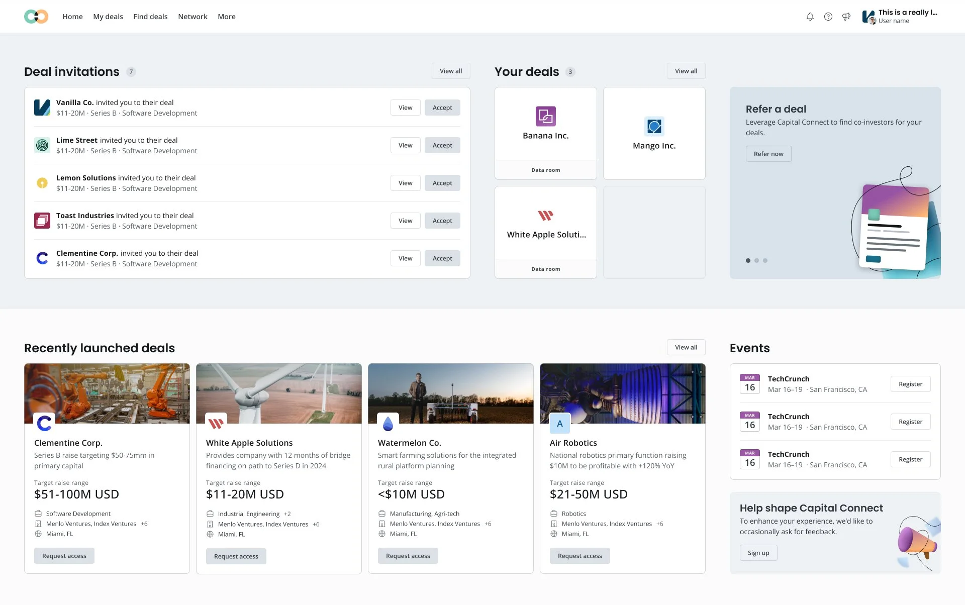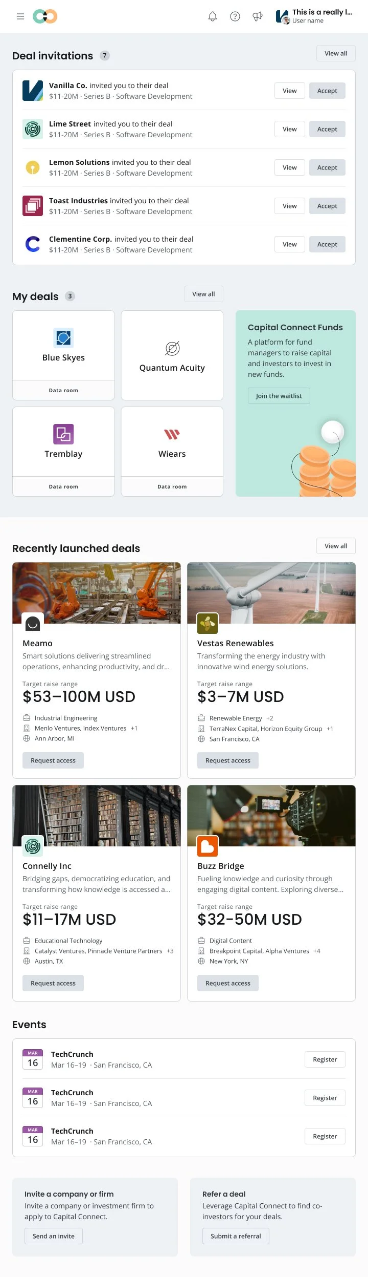 Drive investor attention to deals on the platform by showcasing deals that have been recently launched, easily allow investor to view and accept deal invitations, and quickly access any deals they are actively part of.