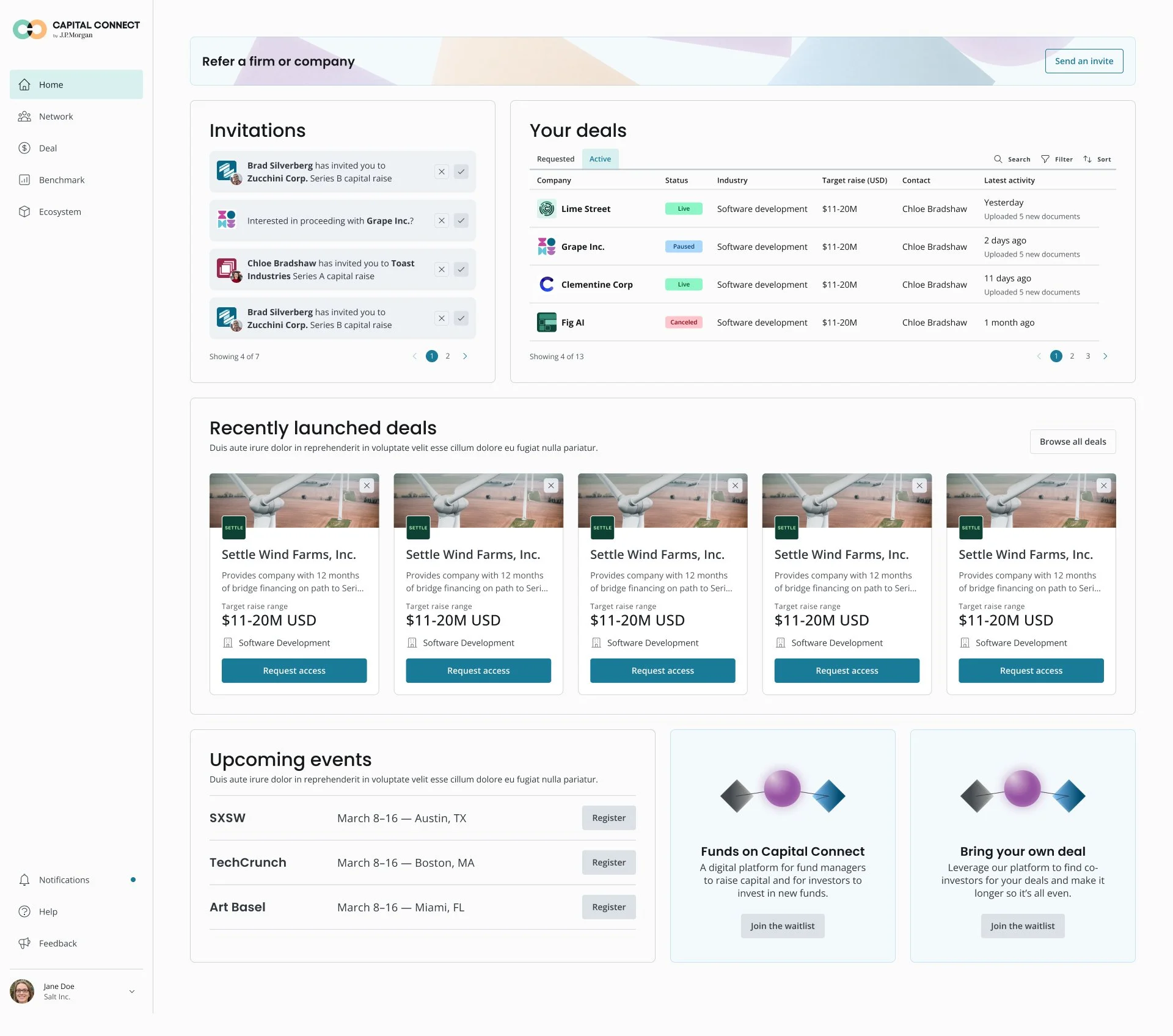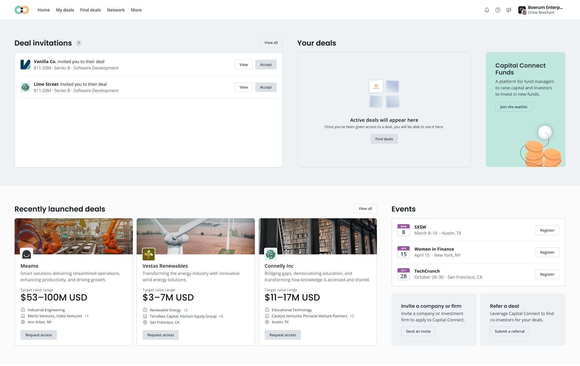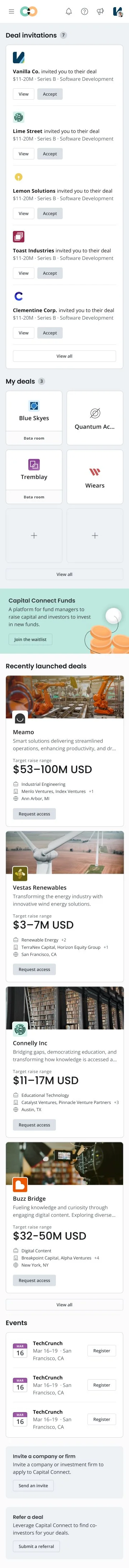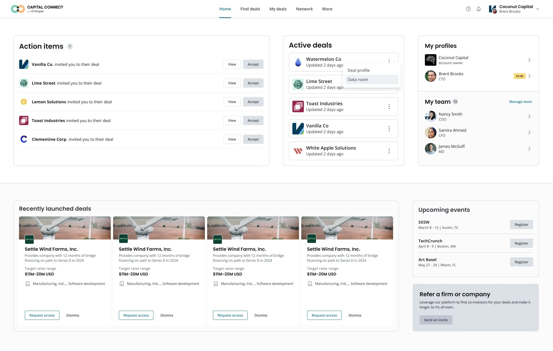 Drive investor attention to deals on the platform by showcasing deals that have been recently launched, easily allow investor to view and accept deal invitations, and quickly access any deals they are actively part of.