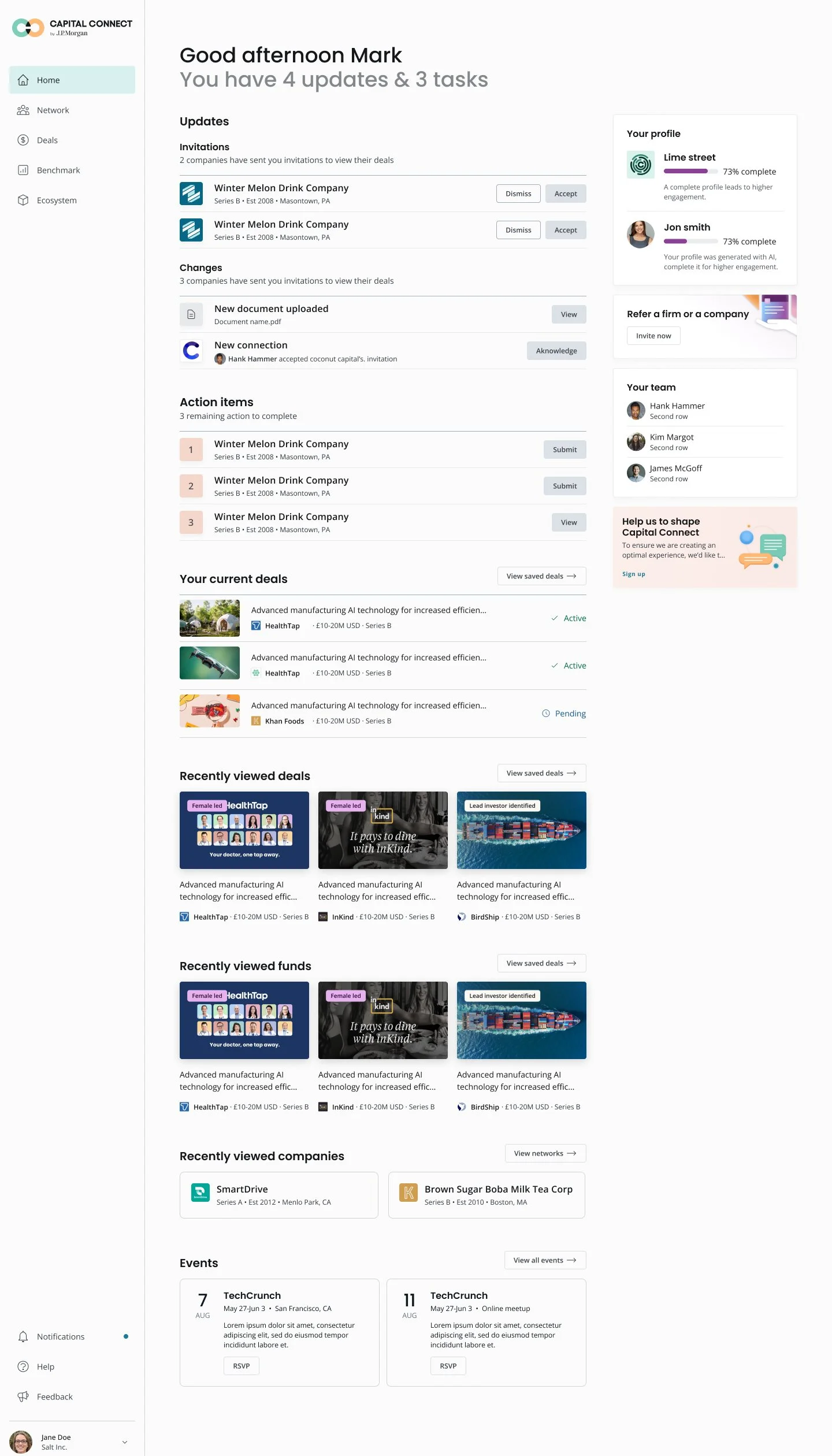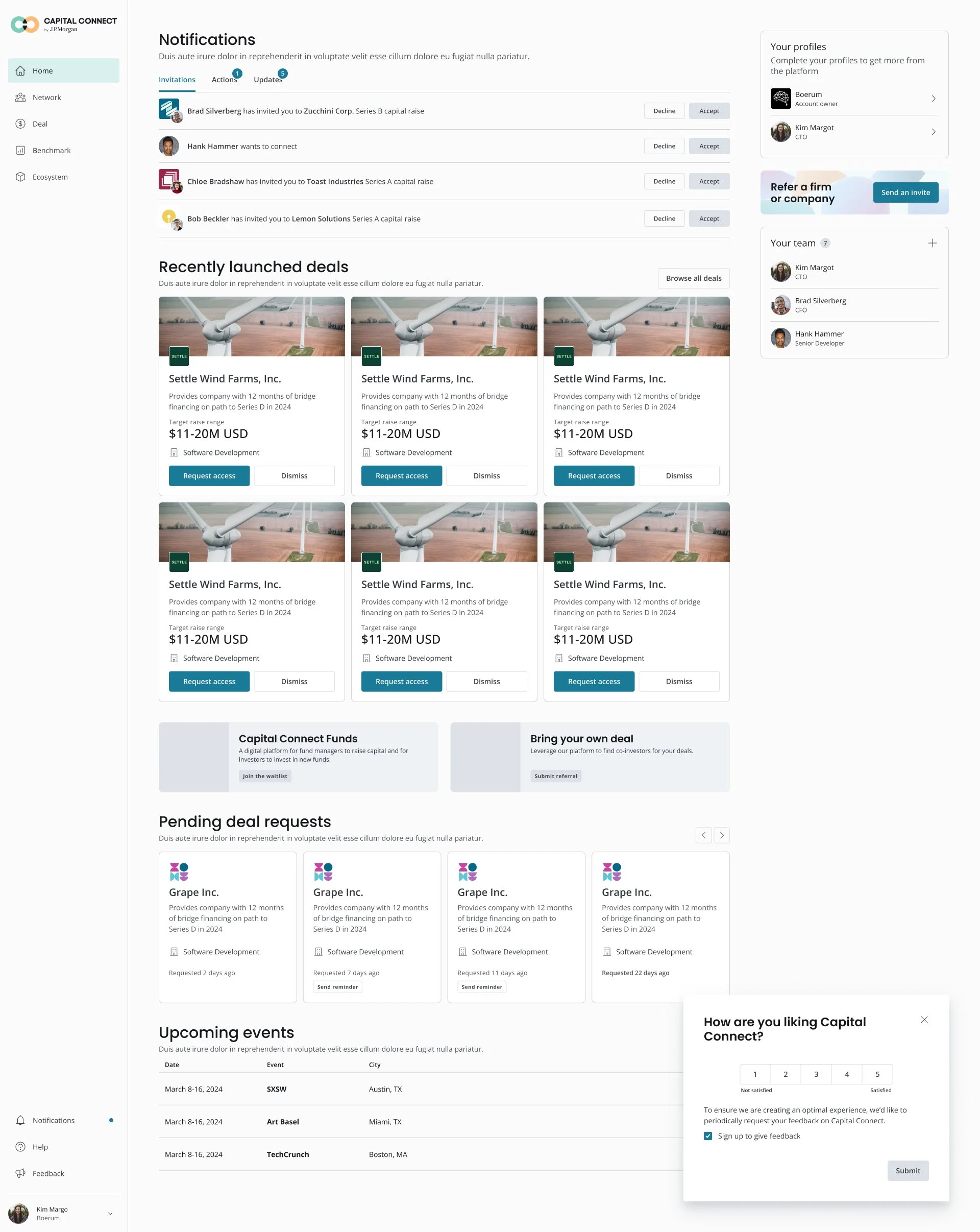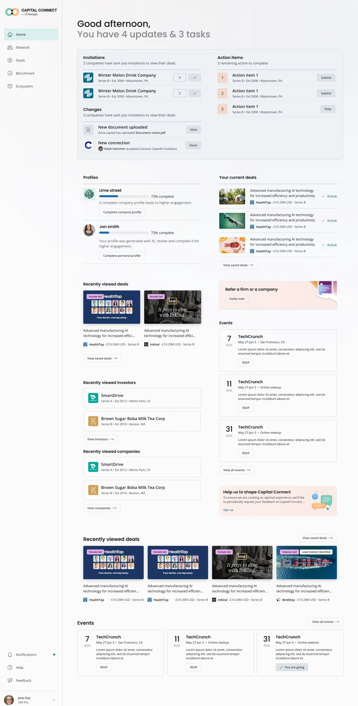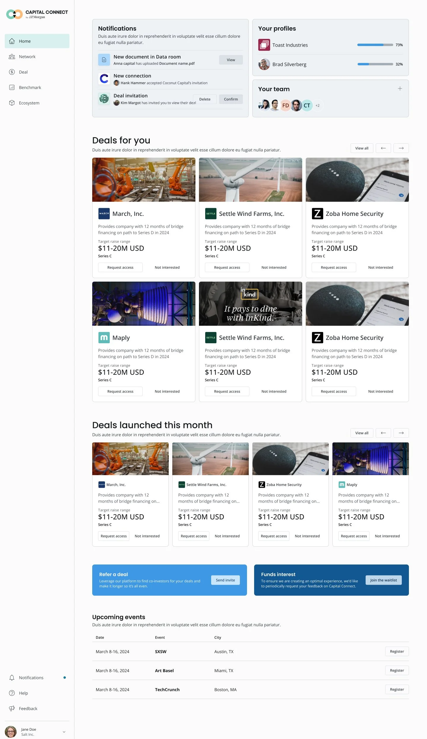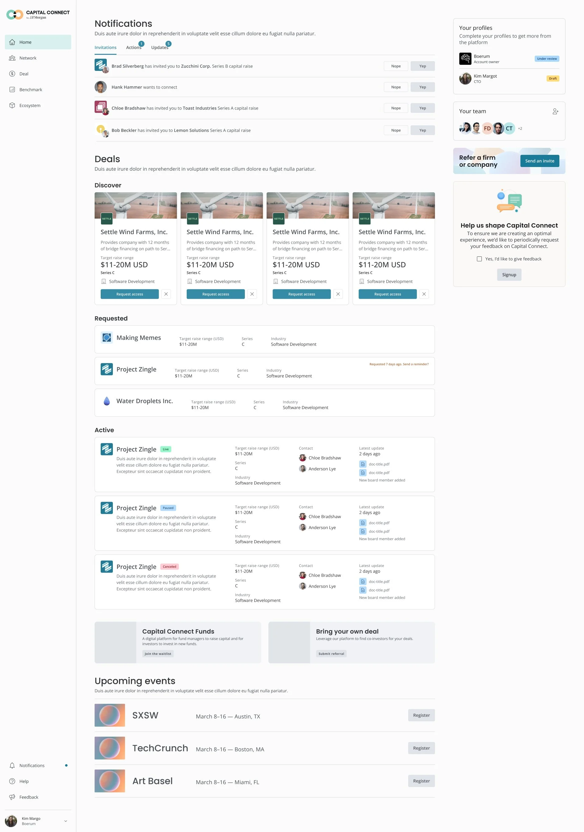 Finally, while a small part of the site, we know that deals truly happen off-line. Showcasing upcoming events and allowing users to register through the platform keeps users logging in so they can know when in-person opportunities are happening therefore keeping them in the loop about all the deals that have launched and any updates to deals they have access to.