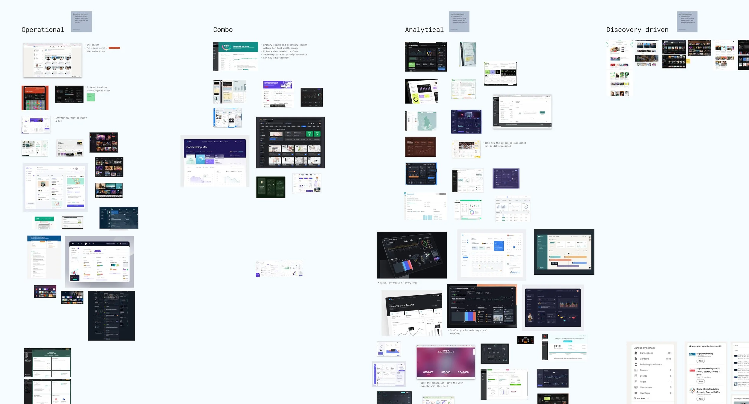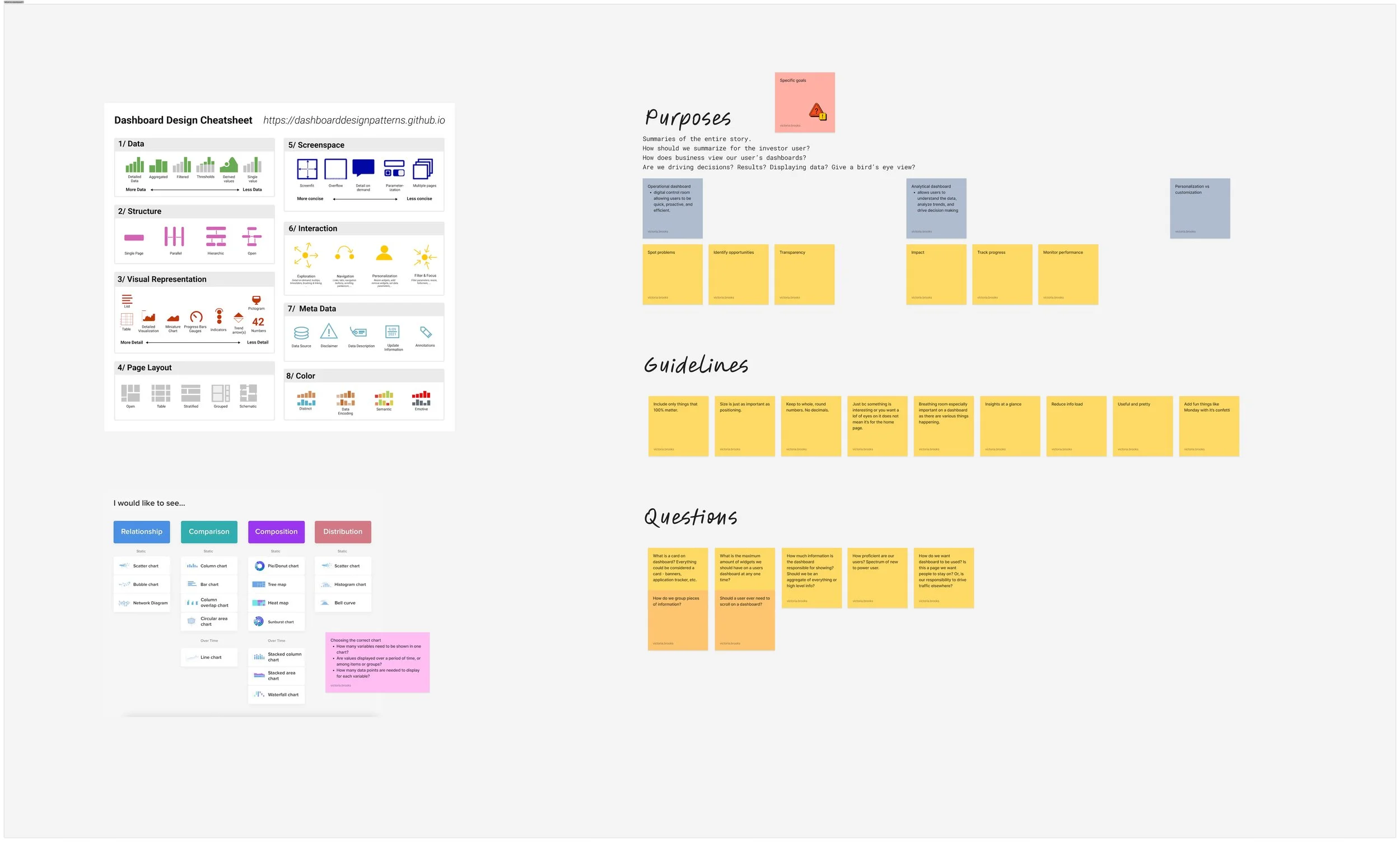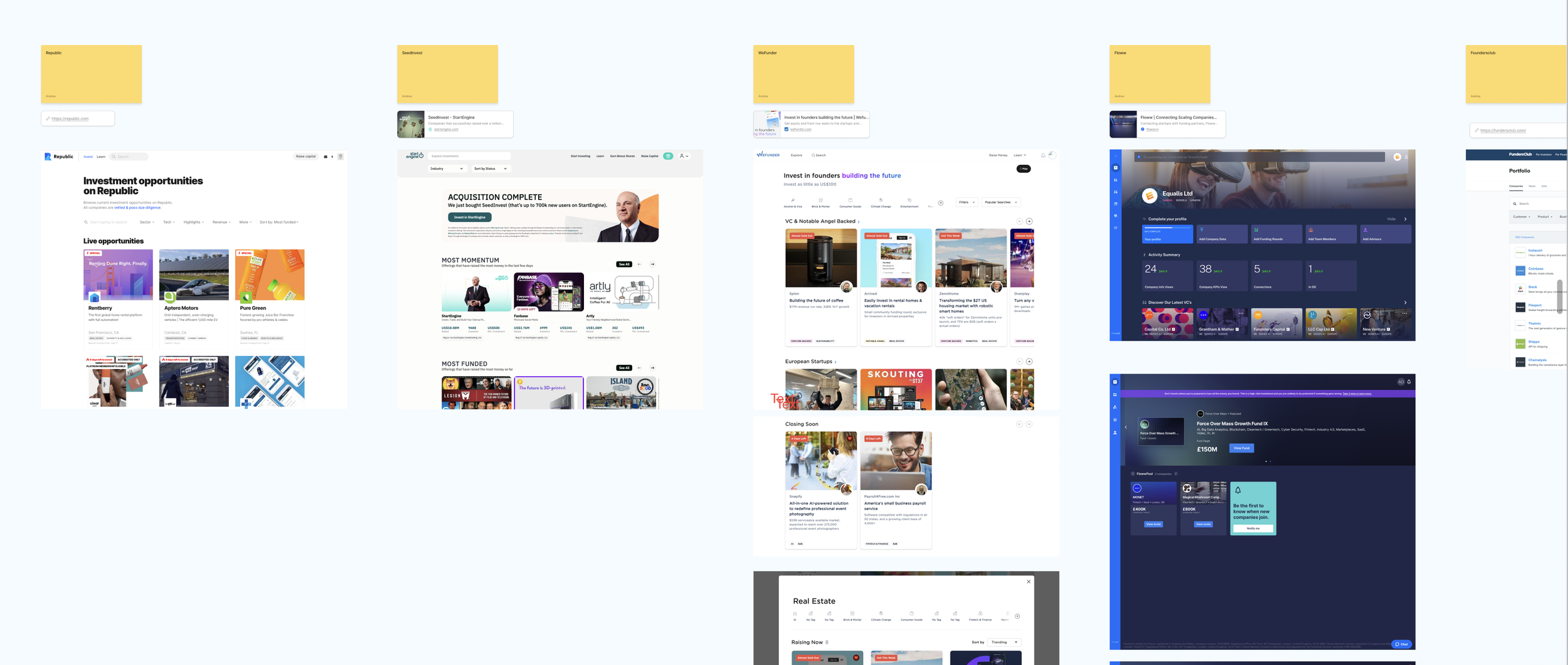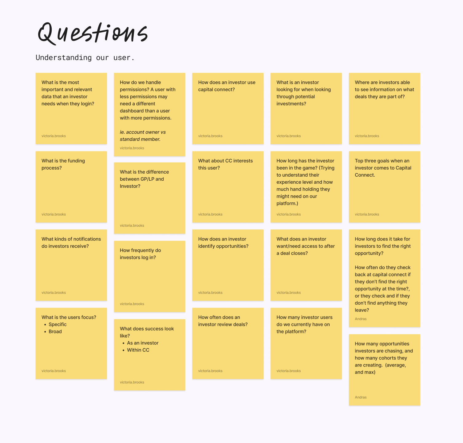 Generally, a dashboard shows an overview of information that comes from various sources that will help the user make informed decisions. Moving forward, to make the project more manageable and meet deadlines, we first focused on the Investor user dashboard. This user needs to be able to quickly identify opportunities. We needed to understand how an investor finds, invests, and keeps track of their deals. Using our KPIs, business goals, and UX goals we put together a list of questions that would help us to learn about our investor user, looked into our competitors when the opportunity presented itself, and put together loads of inspiration.
